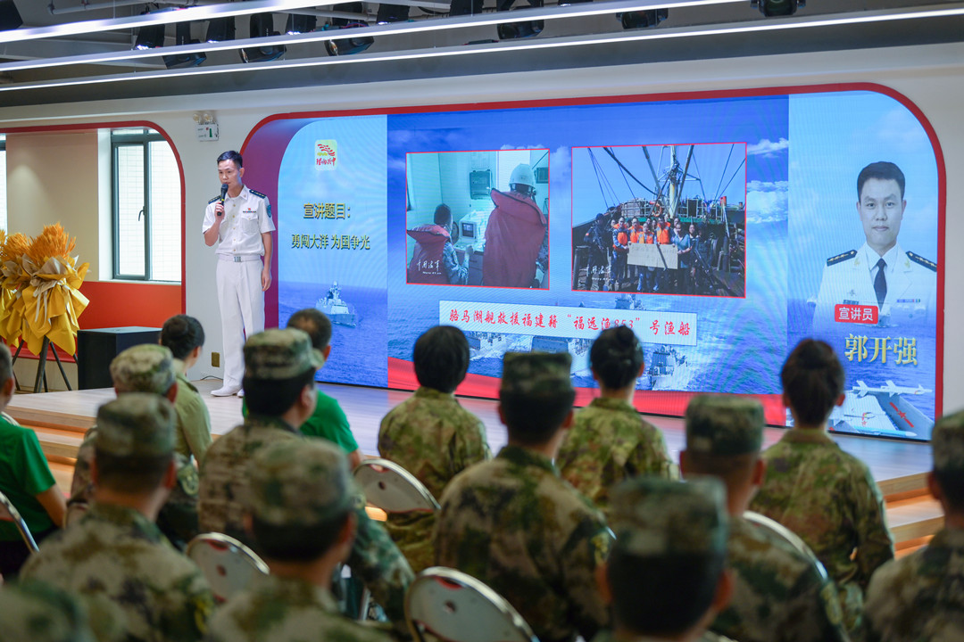 郭開強:勇闖大洋 為國爭光 2008年12月,應(yīng)聯(lián)合國授權(quán)請求,奉中央軍委命令,南海艦隊武漢艦、??谂?、微山湖艦組成第1批護航編隊,拉開了人民海軍舉世矚目的亞丁灣、索馬里護航序幕,這是自600多年前鄭和下西洋以來,中國真正意義上的遠海非戰(zhàn)爭軍事行動,開啟了人民海軍從“黃水”駛向“藍水”的壯麗航程。 91878部隊郭開強干事為大家?guī)碇黝}宣講《勇闖大洋 為國爭光》。 郭開強介紹—— 迄今為止,人民海軍已累計派出44批100余艘次艦艇參加亞丁灣、索馬里海域護航,完成1500多批7000余艘中外船舶護航任務(wù),解救、接護各類船舶近百艘,其中外國船舶超過50%。 護航官兵一次次直面生死、一次次化解危機、一次次挑戰(zhàn)極限,用忠誠與奉獻、責任與擔當,彰顯大國海軍形象,譜寫了人民海軍邁向世界一流海軍的新時代壯歌。 張長城分享軍旅故事。記者 易承樂 攝