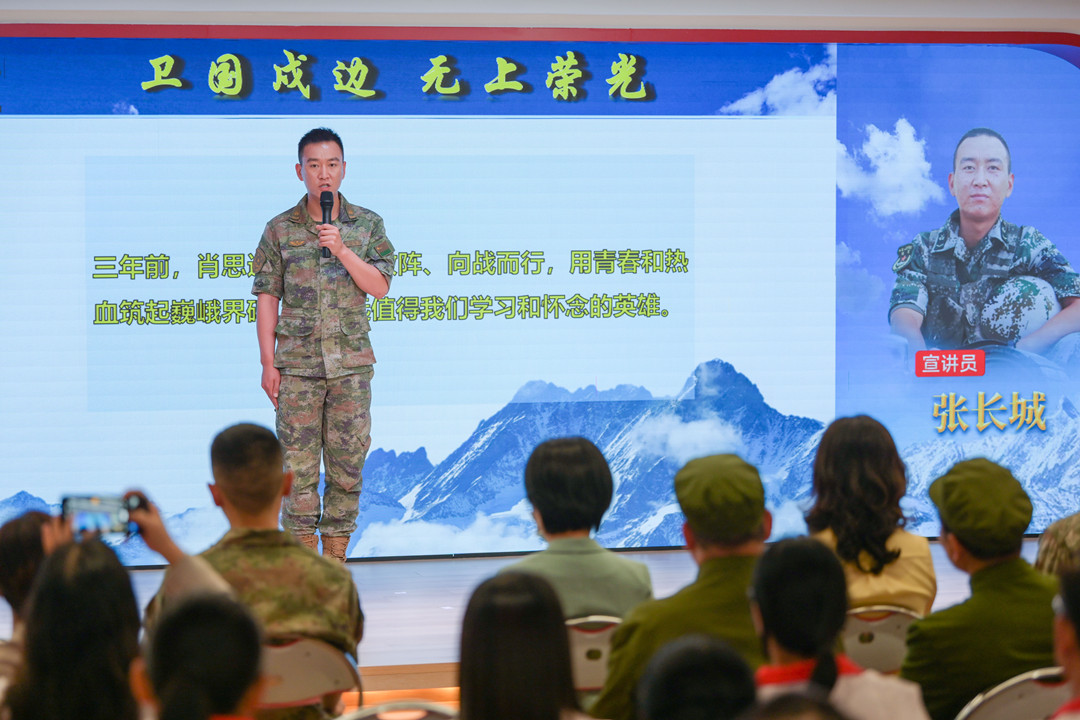 張長城:肖思遠的名字永遠留在連隊 “我是69316部隊加勒萬邊防連‘肖思遠班’班長張長城,很高興今天有機會跟大家進行交流。三年前,肖思遠班長兩闖敵陣、向戰(zhàn)而行,用青春和熱血筑起巍峨界碑,是永遠值得我們學習和懷念的英雄……” 張長城現(xiàn)場作了主題為《衛(wèi)國戍邊 無上榮光》的宣講。 張長城說—— 肖班長犧牲后,連隊組建了“肖思遠班”,班里有一張肖班長的床,每天晚上,戰(zhàn)士們都會將肖班長的被子打開,早上起床再將被子工工整整的疊好;晚上點名,班里的同志輪流向肖班長匯報本班和個人的工作。 連隊每天的點名,呼點的第一個名字永遠是“肖思遠”,全連齊聲答“到、到、到”,那一刻,感覺下面所有人,望過去都是他! ▌與現(xiàn)場基層干部群眾互動交流