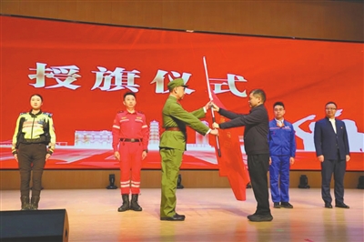 “戎耀香山”老兵宣講工作室負(fù)責(zé)人李克在中山市“理響興中”宣講團授旗儀式上接旗。(資料圖片)