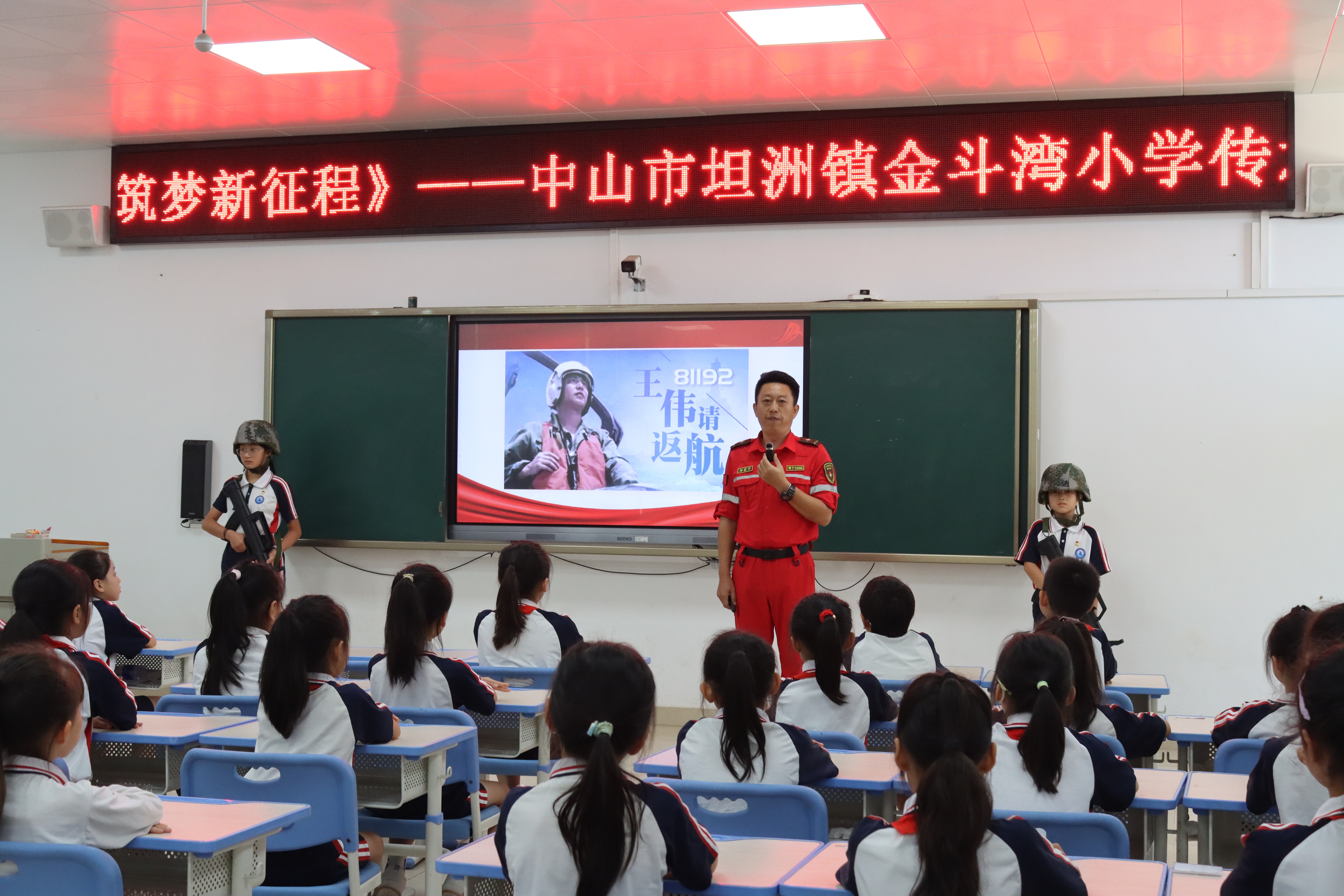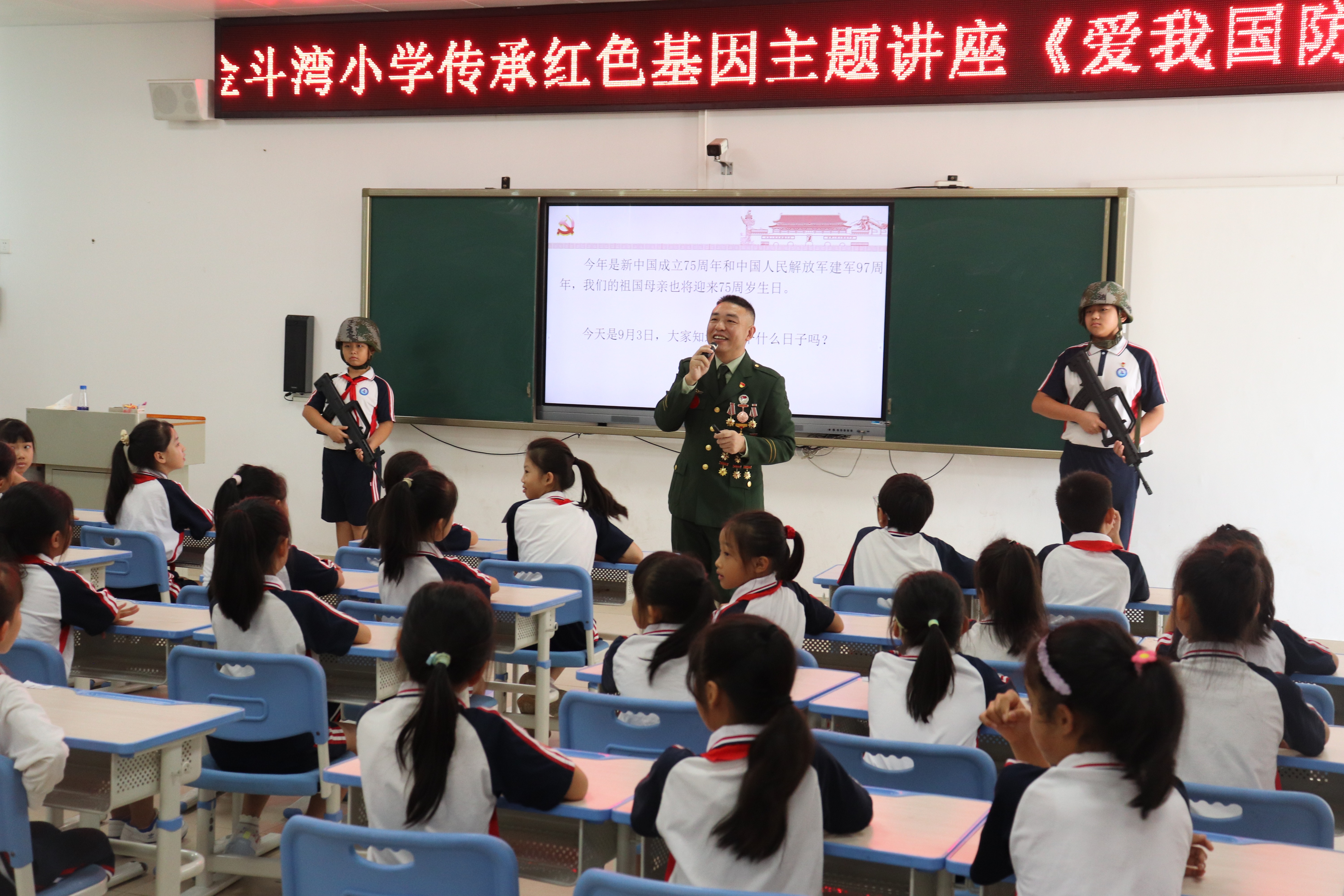 在坦洲鎮(zhèn)金斗灣小學(xué),坦洲鎮(zhèn)“老兵宣講團(tuán)”成員梁華與學(xué)生們展開互動,通過提問的方式引導(dǎo)學(xué)生銘記歷史、傳承紅色基因。