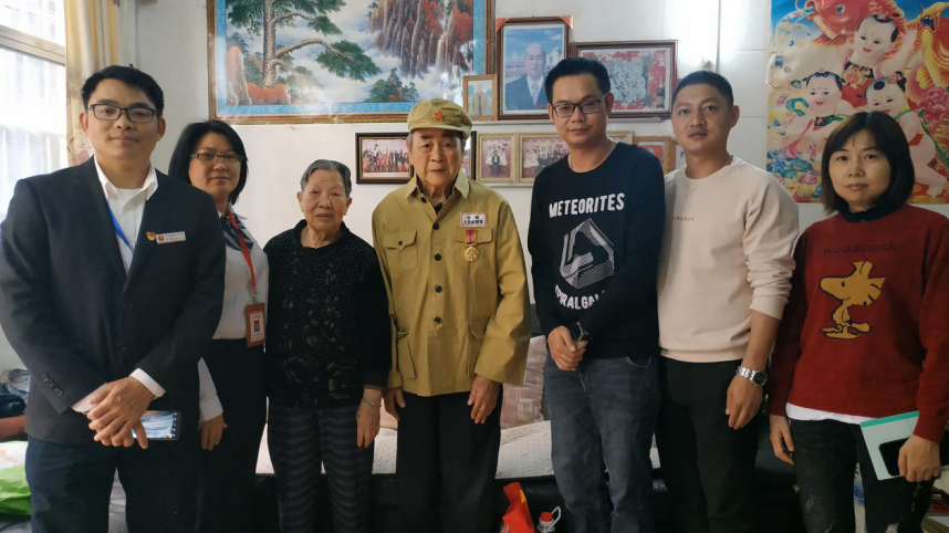 梁澤祥(右2)是參戰(zhàn)退役軍人,慰問組轉(zhuǎn)達(dá)了市退役軍人事務(wù)局、市工商聯(lián)和石岐青協(xié)對他的問候。