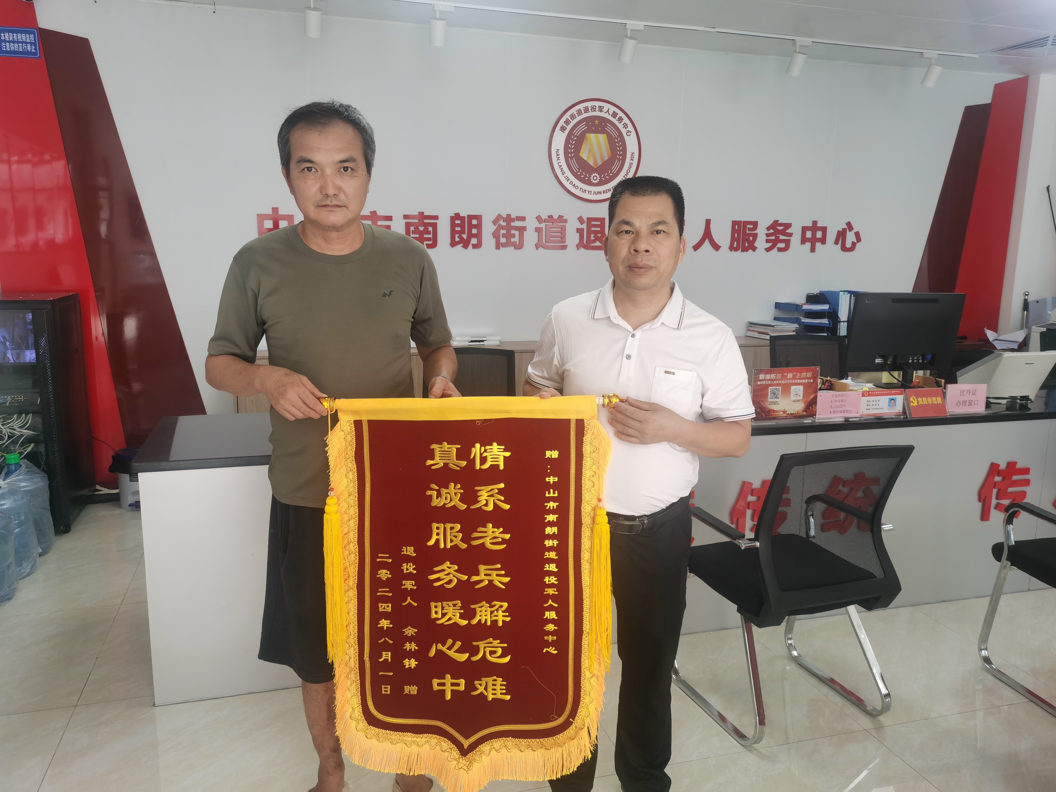 余林鋒(左)向南朗街道退役軍人服務(wù)中心送上錦旗。通訊員供圖