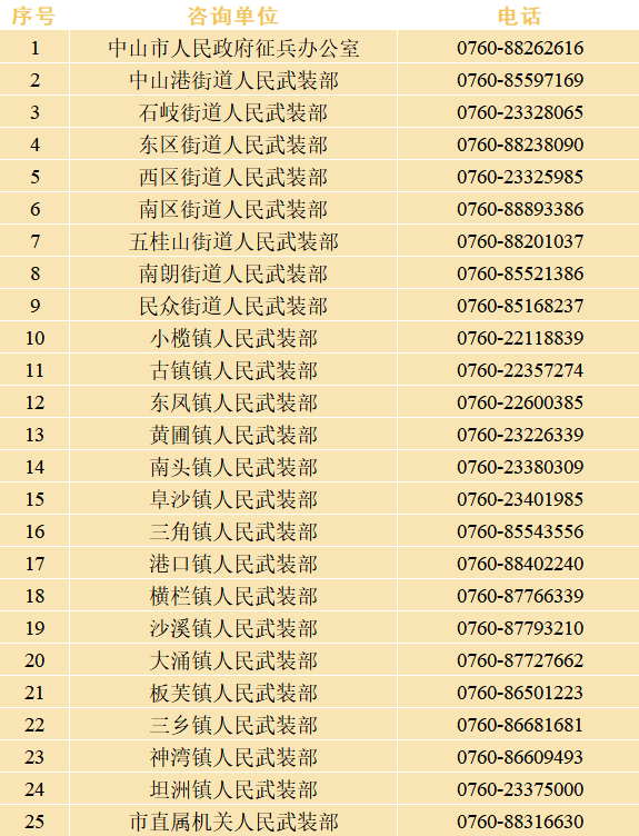 2025年全國征兵(男兵)應(yīng)征報名已于12月1日開始。記者從中山市人民政府征兵辦公室獲悉,即日起,符合條件的青年可通過官方渠道報名參軍,對于征兵政策和流程存有疑問的市民,可通過撥打各鎮(zhèn)街征兵咨詢電話獲得詳細(xì)解答。 應(yīng)征報名(男兵) 應(yīng)征報名提示:男兵報名前須完成兵役登記 全國征兵(男兵)2025年應(yīng)征報名時間 上半年應(yīng)征報名:2024年12月1日至2025年2月10日24時 下半年應(yīng)征報名:2024年12月1日至2025年8月10日24時 男兵應(yīng)征報名對象 高中(含中專、職高、技校)畢業(yè)生及以上文化程度的青年(含高校在校生),年滿18至22周歲(2003年1月1日——2007年12月31日出生);普通高等學(xué)校本??飘厴I(yè)生、上半年符合畢業(yè)條件的畢業(yè)班學(xué)生,年滿18至24周歲;研究生畢業(yè)生及在校生放寬至26周歲;初中畢業(yè)文化程度男青年,年滿18至20周歲。 應(yīng)征報名(女兵) 全國征兵(女兵)2025年應(yīng)征報名時間 上半年應(yīng)征報名:2025年1月1日至2025年2月10日24時 下半年應(yīng)征報名:2025年7月1日至2025年8月10日24時 女兵應(yīng)征報名對象 上半年應(yīng)征報名:普通高等學(xué)校和科研機(jī)構(gòu)全日制應(yīng)屆畢業(yè)生及在校生,年滿18至22周歲(2003年1月1日——2007年12月31日出生),全日制研究生應(yīng)屆畢業(yè)生及在校生放寬至26周歲;2024年普通高等學(xué)校全日制本??茟?yīng)屆畢業(yè)生可以報名參加2025年上半年女兵征集,年齡放寬至23周歲。 下半年應(yīng)征報名:普通高中應(yīng)屆畢業(yè)生、普通高等學(xué)校和科研機(jī)構(gòu)全日制應(yīng)屆畢業(yè)生及在校生,年滿18至22周歲(2003年1月1日——2007年12月31日出生),全日制研究生應(yīng)屆畢業(yè)生及在校生放寬至26周歲。 報名方式 報名方式征兵報名官方網(wǎng)站:全國征兵網(wǎng) www.gfbzb.gov.cn 軍隊媒體移動旗艦客戶端:中國軍號App 中山各鎮(zhèn)街征兵咨詢電話