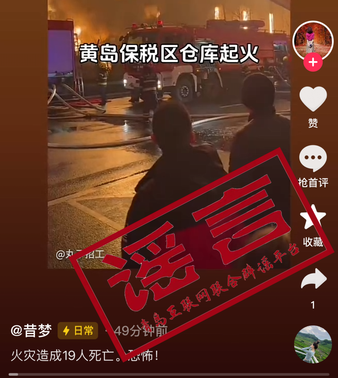 有網(wǎng)民在社交平臺發(fā)布青島火災相關(guān)視頻,并配以“火災造成19人死亡”“恐怖”等文字,此系謠言!