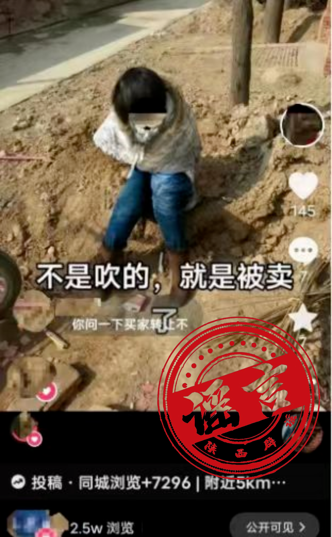 2024年1月10日,網(wǎng)民張某某(女,39歲,蒲城龍陽(yáng)人)為博取關(guān)注、吸引流量,利用了一張自己14年前拍攝坐在土堆前的照片,并配有“不是吹的,就是被賣了”的字眼制作成視頻后,發(fā)布在抖音平臺(tái)上,同時(shí)與網(wǎng)民互動(dòng)交流,先后有超過2.5萬(wàn)人次瀏覽。