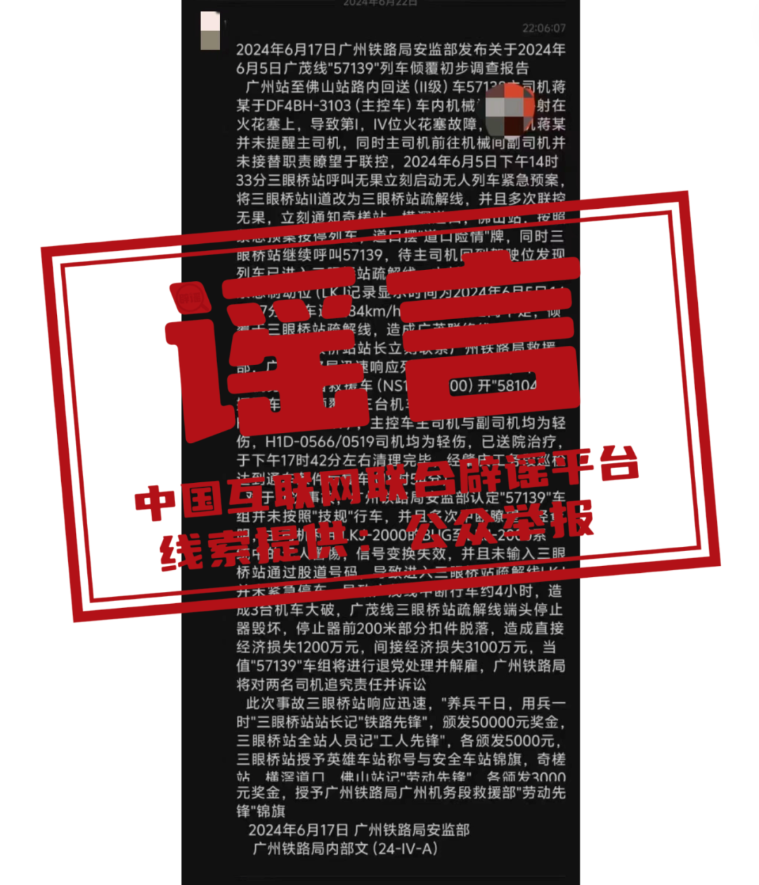 辟 謠 網(wǎng)傳“廣州鐵路局安監(jiān)部2024年6月5日廣茂線57139列車傾覆初步調(diào)查報告”為虛假信息