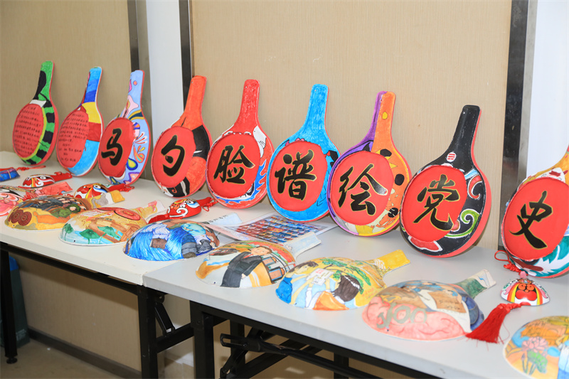 中國共產(chǎn)黨成立100周年標(biāo)識、井岡山勝利會師、南昌起義、嘉興游船上舉行的中共一大、萬里長征路……分享會現(xiàn)場,刻畫了一個個黨史故事的木瓢排列成行,十分引人注目?!斑@是國家級非物質(zhì)文化遺產(chǎn)——馬勺臉譜。它是陜西的傳統(tǒng)民間藝術(shù),以馬勺作‘紙’,將社火臉譜以彩繪的形式繪制在上面?!瘪R勺臉譜傳承者、沙溪中學(xué)老師馬世杰介紹。作為一名美術(shù)老師,馬世杰通過民間藝術(shù)的再創(chuàng)新來引導(dǎo)學(xué)生學(xué)習(xí)黨史,在他的帶領(lǐng)下,沙溪中學(xué)的學(xué)生將南粵特色、中山元素、國風(fēng)動漫等融入馬勺臉譜的創(chuàng)作中?!袄L制黨史故事前,我們查閱了大量資料,并向?qū)<覍W(xué)者請教,在創(chuàng)作中引導(dǎo)學(xué)生們了解、學(xué)習(xí)黨史。”